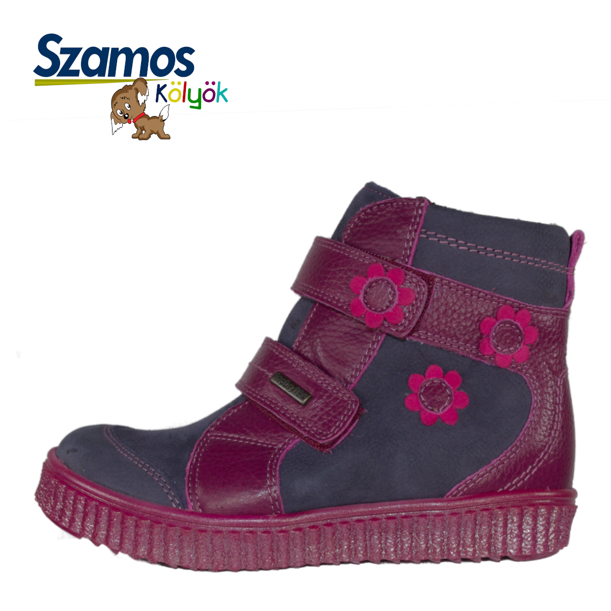 Szamos kid girl boots purple with burgundy velcro straps and fuxia flowers big kid size